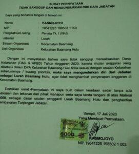 “Saya mengundurkan diri dari jabatan sebagai Lurah Baamang Hulu, agar tidak menghambat penyerapan anggaran di Kecamatan Baamang,” ujar Kasmojoyo yang tertuang dalam surat tersebut.